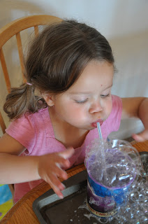 Materials Needed: cup filled with a small amount of water and dish soap, drinking straw, towel