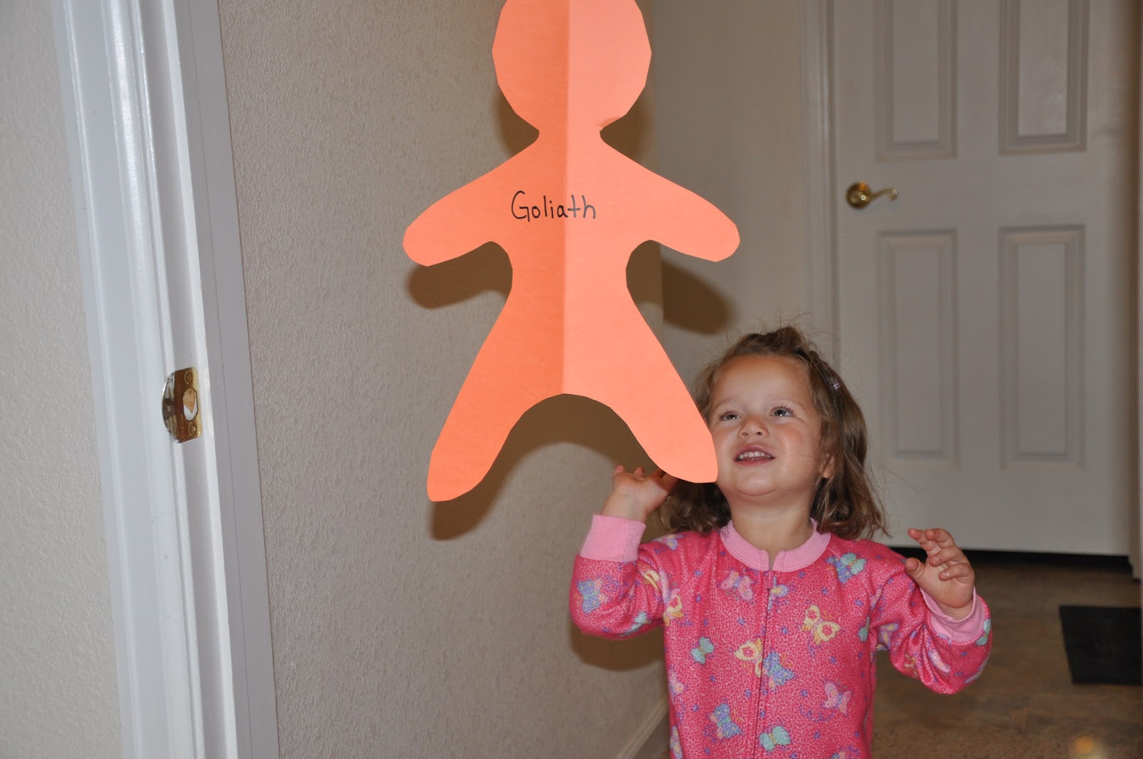 Now, the child is going to try to throw the “balls” at Goliath in the doorway.