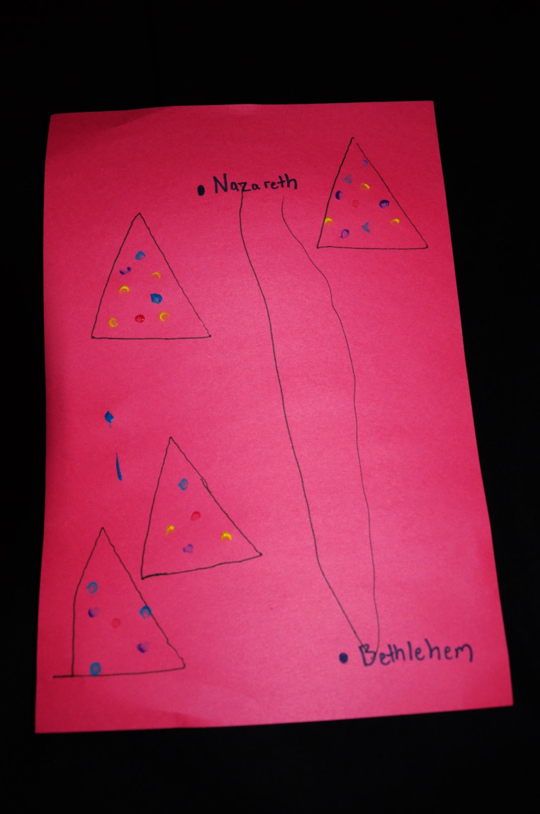 On a piece of construction paper, draw two dots, one on the top of page and one towards the bottom. Label one Nazareth and the other one Bethlehem.  Have the child draw a line between the two dots, explaining as they so that Mary and Joseph had to walk for several days to get from Nazareth to Bethlehem.