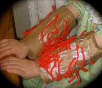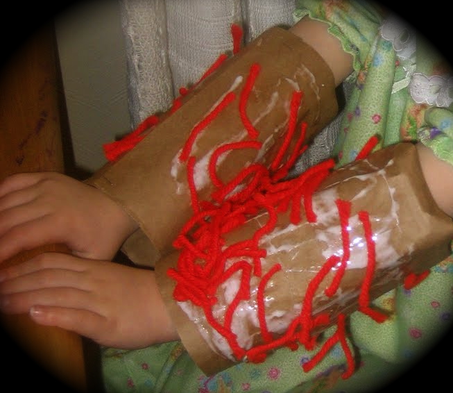 Cut out two rectangular pieces of paper that will fit around the child’s arm. Cut several pieces of yarn. Glue the yarn onto the pieces of paper. Then, staple the papers into a circle and place over the child’s arms.