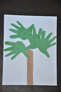 Activity: Cut out a brown rectangle onto sheet of paper. Help the child glue it onto the paper like a tree trunk. Trace the child’s hands on the green construction and cut out. Let the child glue the hands to the top of the tree trunk like leaves. Then, let the child decorate the leaves with fruit (dots made with the red marker).