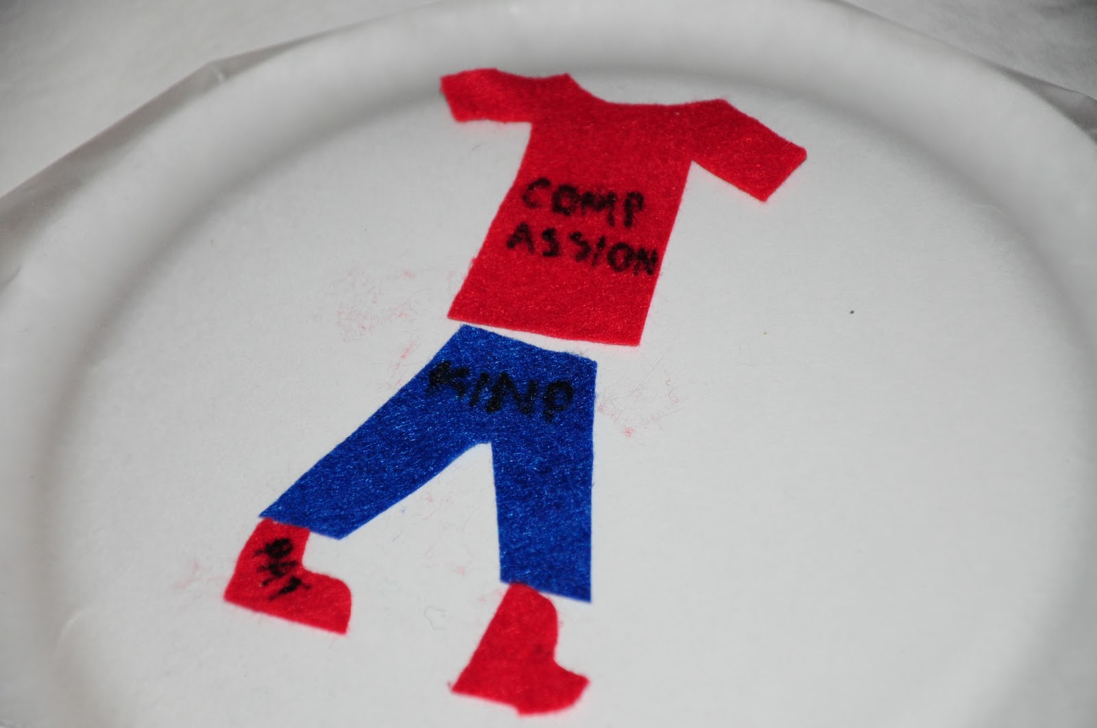 Cut out several pieces of felt in the shape of various pieces of clothing (shirt, pants, shoes, etc). Write the names of several characteristics from the verse including compassion, kindness, humility, gentleness, and patience on to the felt pieces of clothes.