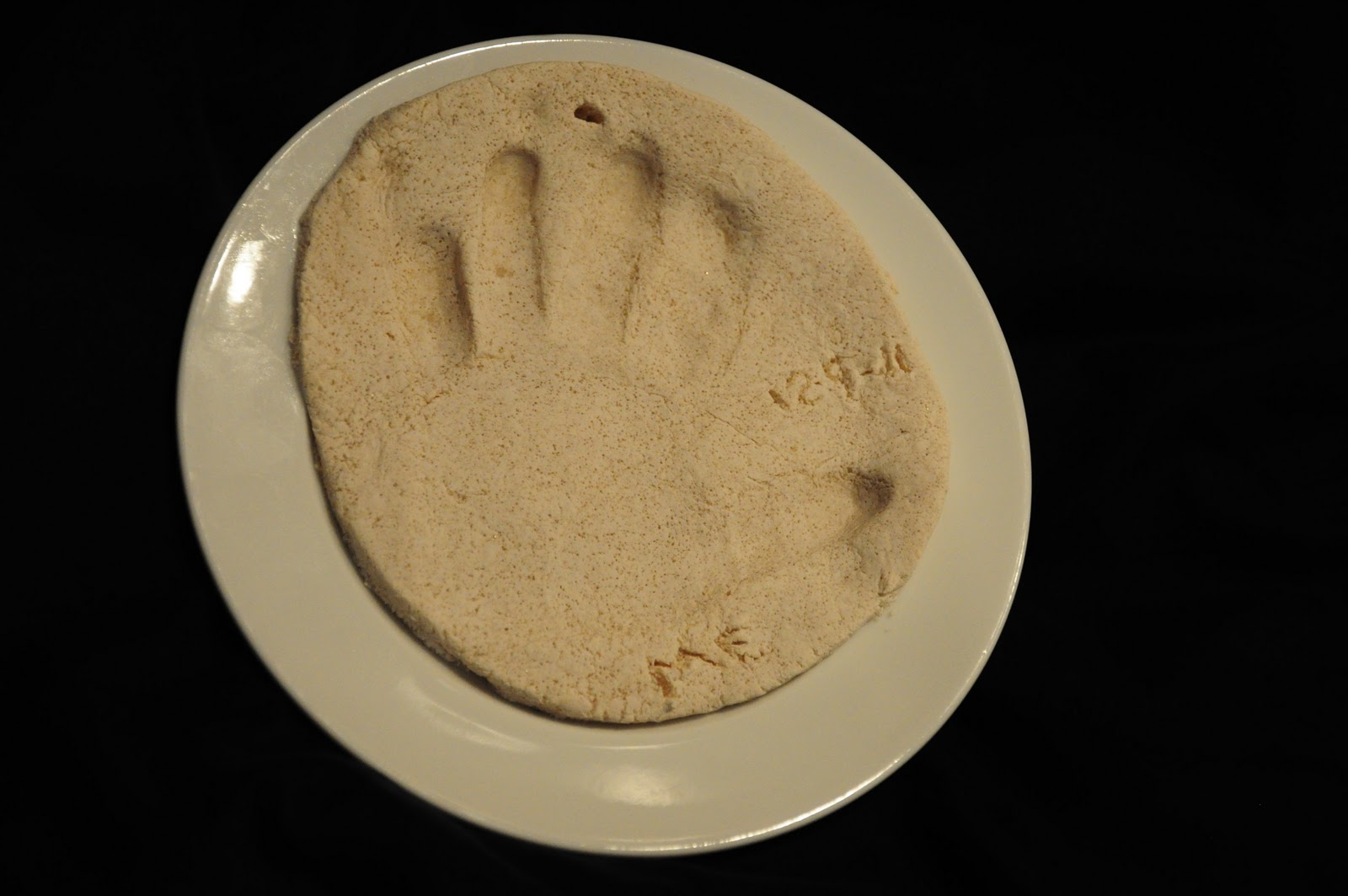 Mix together 1 cup of flour, 1/2 cup of salt, and 1/2 cup water. Grease a cookie sheet and let the child roll out the dough. Help the child make handprints. Make sure you make a hole at the top with the toothpick to hang up the ornament with the ribbon.